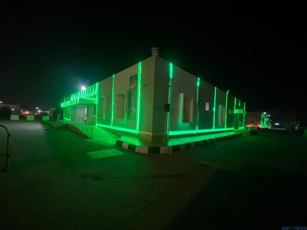 كما تزين المبنى ليلا بالاضاءة الخضراء وذلك احتفاء باليوم الوطني 93.