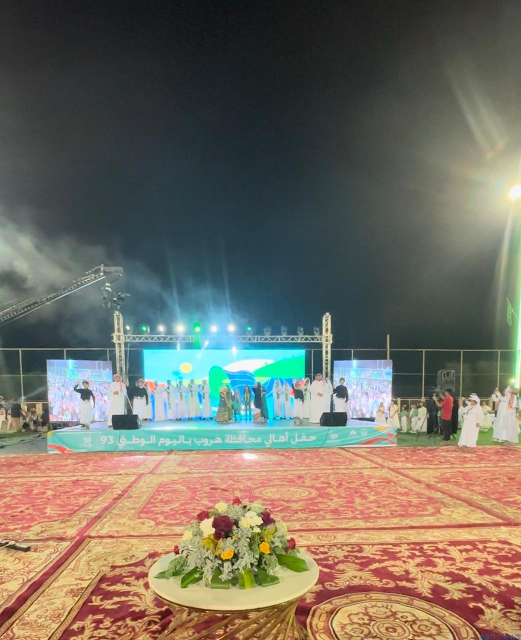 حيث بدأ الحفل بالسلام الملكي ثم آيات من الذكر الحكيم تلاها كلمه راعي الحفل والتي القاها محافظ هروب عبدالرحمن بن زيد الهزاني ، والقى شاعر المنطقه يحي رياني قصيده وطنيه ثم أحييت العديد من الفقرات الفنيه و الرقصات والفلكورات الشعبيه والاهازيج الوطنيه.