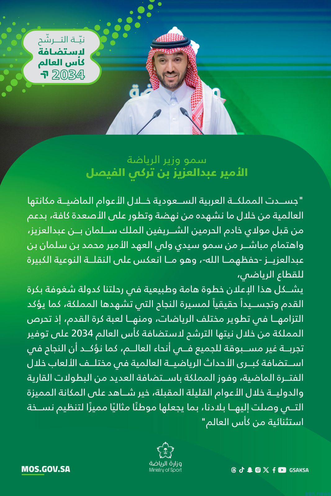 وأضاف سموه: “ويشكل هذا الإعلان خطوة هامة وطبيعية في رحلتنا كدولة شغوفة بكرة القدم وتجسيداً حقيقياً لمسيرة النجاح التي تشهدها المملكة، كما يؤكد التزامها في تطوير مختلف الرياضات، ومنها لعبة كرة القدم، إذ تحرص المملكة من خلال نيتها الترشح لاستضافة كأس العالم 2034 على توفير تجربة غير مسبوقة للجميع في أنحاء العالم، كما نؤكد أن النجاح في استضافة كبرى الأحداث الرياضية العالمية في مختلف الألعاب خلال الفترة الماضية، وفوز المملكة باستضافة العديد من البطولات القارية والدولية خلال الأعوام القليلة المقبلة، خير شاهد على المكانة المميزة التي وصلت إليها بلادنا، بما يجعلها موطنًا مثاليًا مميزًا لتنظيم نسخة استثنائية من كأس العالم.