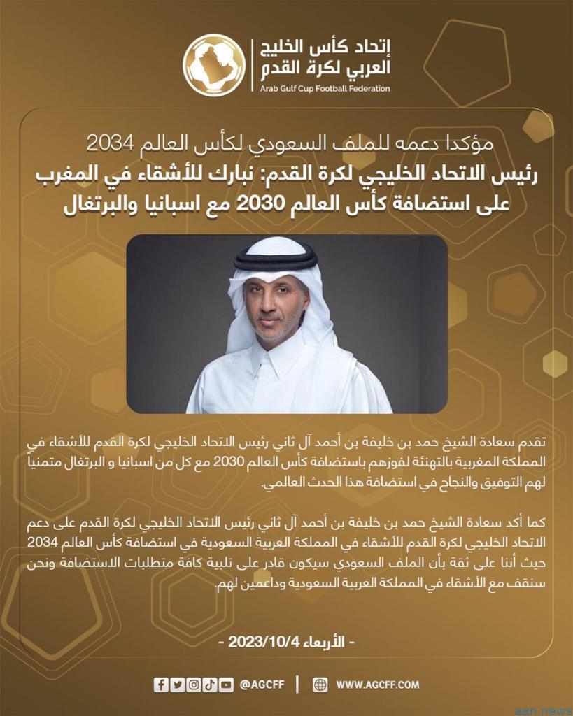 كما أكد سعادة الشيخ حمد بن خليفة بن احمد آل ثاني رئيس الاتحاد الخليجي لكرة القدم على دعم الاتحاد الخليجي لكرة القدم للاشقاء في المملكة العربية السعودية في استضافة كاس العالم 2034 حيث أننا على ثقة بان الملف السعودي سيكون قادر على تلبية كافة متطلبات الاستضافة ونحن سنقف مع الاشقاء في المملكة العربية السعوديه و داعمين لهم .