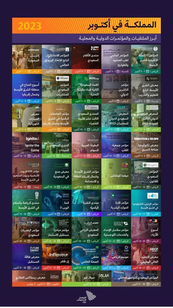 وإلى جانب ما تشهده المملكة من فعاليات نوعية خلال الفترة الماضية، لا زالت في انتظار انطلاق العديد من الفعاليات العالمية المميزة والجاذبة لملايين الزوار من داخل المملكة وخارجها. فما زالت الأسابيع والشهور المقبلة تحمل الجديد والعديد من الأنشطة والفعاليات من مؤتمرات ومعارض دولية في مجالات مختلفة ومتنوعة، خاصة إذا عرفنا أن الهيئة العامة للمعارض والمؤتمرات في المملكة قد أعلنت عن نحو 43 معرضا ومؤتمرا في كافة أنحاء المملكة خلال شهر أكتوبر فقط، ومن بينها أسبوع المناخ في الشرق الأوسط وشمال أفريقيا، ومؤتمر الجامعات الرقمية، ومعرض السيارات الكهربائية، والدوري السعودي للسيدات، ومعرض صنع في السعودي، وأسبوع الأزياء، وغيرها، إلى جانب فعاليات موسم الرياض الذي يعد الأكبر في المنطقة العربية والشرق الأوسط، بالإضافة إلى العديد من المجالات والموضوعات المتعددة الأخرى التي تناسب كافة الأعمار والأعمال والأذواق.