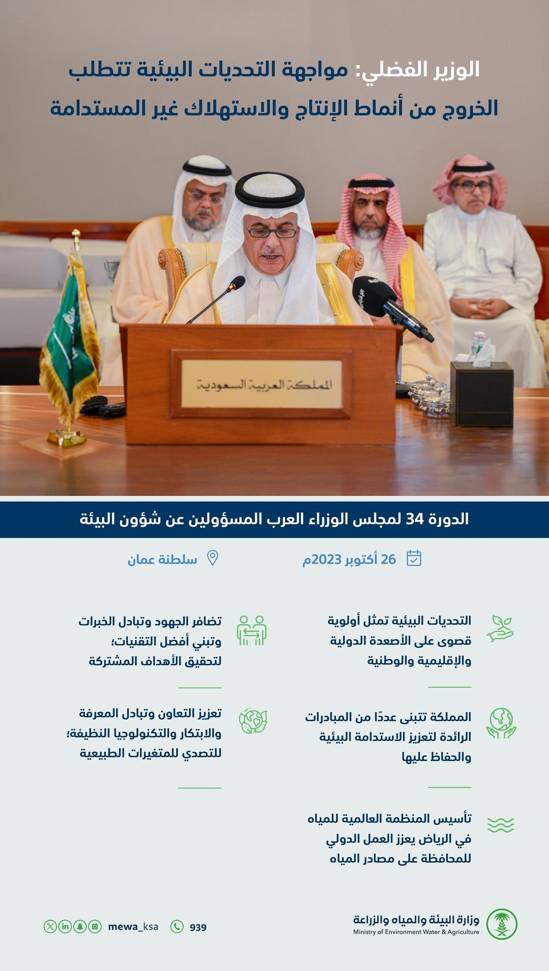 جاء ذلك خلال مشاركة معاليه في الدورة (34) لمجلس الوزراء العرب المسؤولين عن شؤون البيئة التي عقدت اليوم، في سلطنة عمان، بحضور ممثلين من الأمانة العامة لجامعة الدول العربية والمنظمات الإقليمية الدولية المتخصصة، موضحاً أن المملكة استمرارًا لجهودها المحلية في تحقيق التوازن بين التنمية الاقتصادية والحفاظ على الموارد الطبيعية، ومن خلال إستراتيجيات ومبادرات نوعية وأطر مؤسسية وتنظيمية، أنشأت صندوقًا وخمسة مراكز بيئية متخصصة تغطي كافة المجالات البيئية، كما عملت على تبني عدد من المبادرات الرائدة لتعزيز الاستدامة البيئية والحفاظ عليها؛ أبرزها مبادرة السعودية الخضراء التي تستهدف تنمية الغطاء النباتي ورفع نسبة المناطق المحمية إلى (30%)، وتبني نهج الاقتصاد الدائري الكربوني للوصول للحياد الصفري عام 2060م -بإذن الله-.