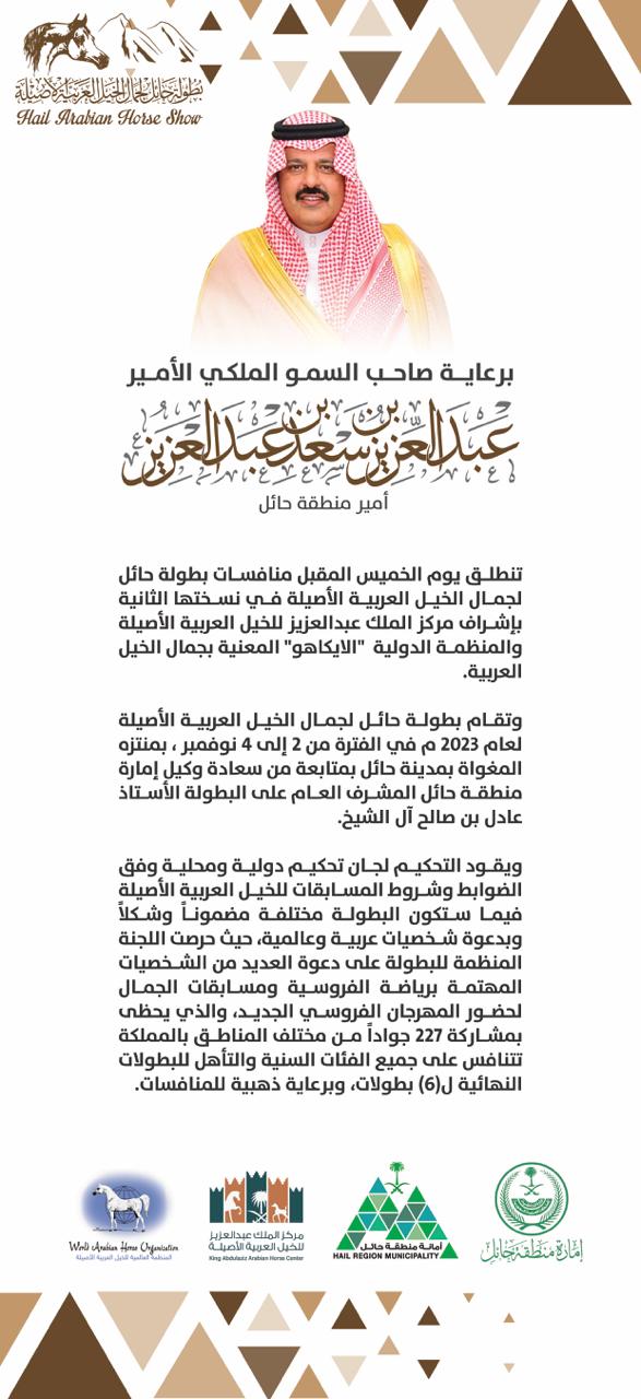 برعاية صاحب السمو الملكي الأمير عبدالعزيز بن سعد بن عبدالعزيز أمير منطقة حائل تنطلق يوم الخميس المقبل منافسات بطولة حائل لجمال الخيل العربية الأصيلة في نسختها الثانية بإشراف مركز الملك عبدالعزيز للخيل العربية الأصيلة والمنظمة الدولية “الايكاهو” المعنية بجمال الخيل العربية .