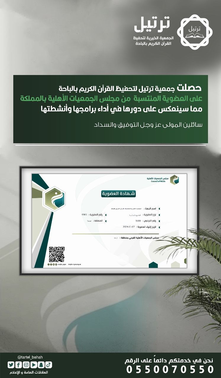 استمرارًا للجهود المبذولة لتحقيق أهداف جمعية ترتيل لتحفيظ القران الكريم بالباحة ؛ حصلت الجمعية مؤخراً على إحدى عضويات مجلس الجمعيات الأهلية بالمملكة وهي العضوية المنتسبة للمجلس .