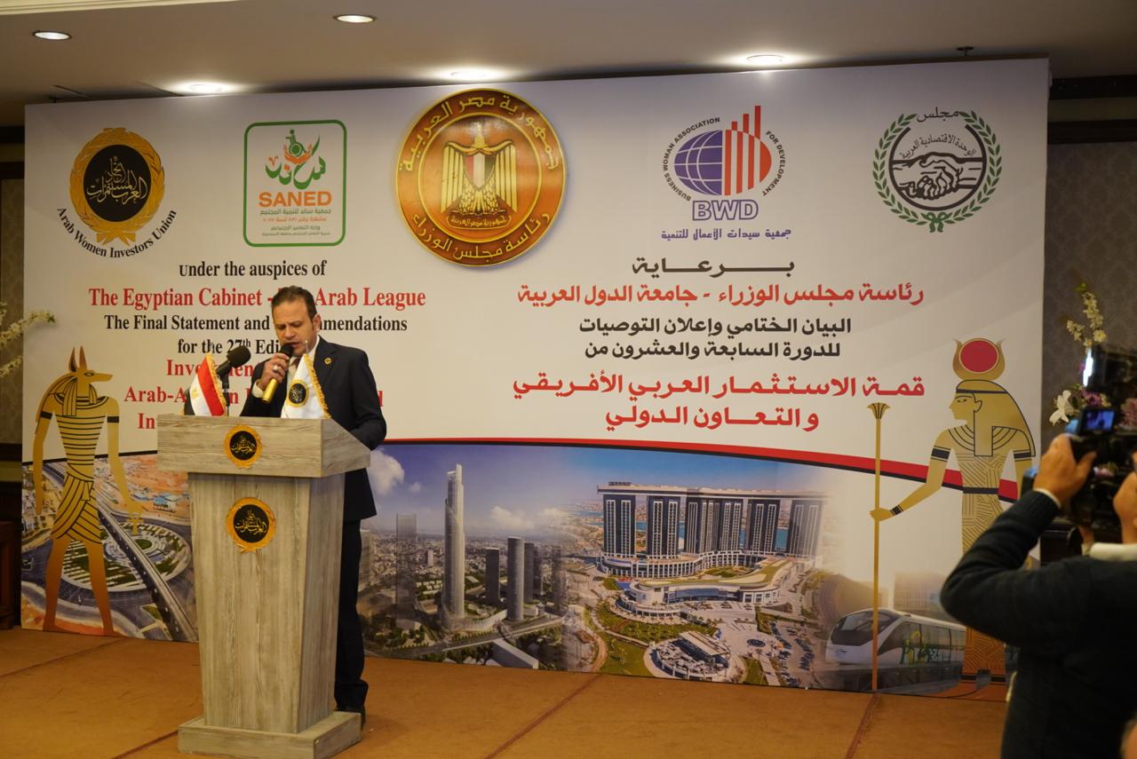 جاء ذلك خلال الاحتفال بالإعلان الرسمى عن البيان الختامى وتوصيات قمة” الاستثمار العربي الإفريقي والتعاون الدولى ” وبحضور ممثلى جامعة الدول العربية و الوزارات والهيئات والمؤسسات الحكومية والسفارات والسلك الدبلوماسي والجهاز الوطنى للإدارة والاستثمار وجهاز تنمية المشروعات والجامعات والاتحاد العام للجمعيات والمؤسسات الأهلية وتنسيقيةشباب الاحزاب والسياسيين ومؤسسة شباب قادرون ورجال وسيدات الأعمال فى مصر وعدد من الدول العربية والإفريقية والأسيوية