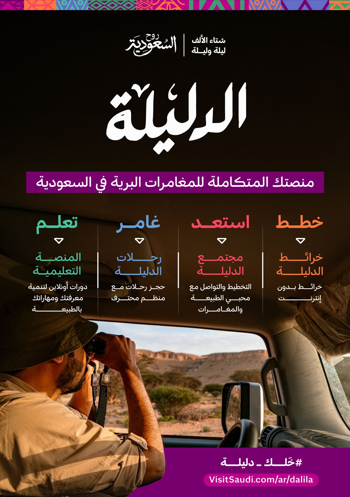 الرياض – يناير 2025: أطلقت روح السعودية الهوية الرسمية للسياحة السعودية “الدليلة” على موقعها الإلكتروني وتطبيق روح السعودية، ويقوم “الدليلة” بتعريف محبي المغامرات بالطرق البرية، إذ يحتوي على العديد من البرامج، والمنتجات، والأماكن السياحية المتنوعة، ويُسهل الوصول إلى عدد من الأماكن والباقات السياحية المختلفة التي تسهم في تعزيز تجربة الزوار من داخل وخارج المملكة ضمن برنامج “شتاء السعودية”.