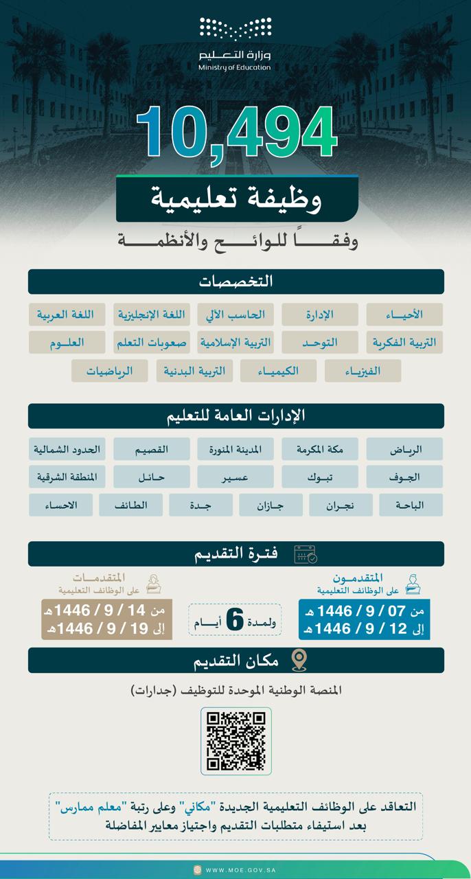أعلنت وزارة التعليم عن فتح التقديم على (10,494) وظيفة تعليمية بنظام التعاقد المكاني في جميع الإدارات العامة للتعليم، للعام الدراسي 1447هـ، من خلال المنصة الوطنية الموحدة للتوظيف “جدارات”، وذلك لجميع الخريجين ووفق تخصصات محددة لسد الاحتياج.