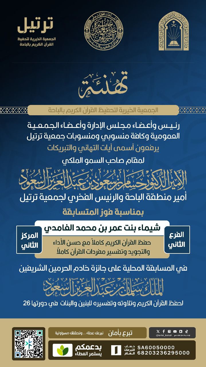 وبهذه المناسبة الغالية رفع رئيس مجلس إدارة جمعية ترتيل الشيخ أحمد بن سفر الغامدي التهنئة لصاحب السمو الملكي الامير الدكتور حسام بن سعود بن عبدالعزيز أمير منطقة الباحة والرئيس الفخري للجمعية معربًا عن بالغ سروره بهذا التكريم الكبير والشرف العظيم للجمعية ولكافة منسوبيها وطلابها ولأبناء وبنات منطقة الباحة ، مقدمًا شكره وتقديره باسمه ونيابة عن منسوبي الجمعية وطلابها وطالباتها لسموه الكريم على ما تلقاه الجمعية من دعم ورعاية من لدن سموه الكريم ، داعيًا الله العلي القدير أن يسدد الابنة شيماء الغامدي وأن يجعل القران الكريم ربيع قلبها ونور بصرها وبصيرتها .