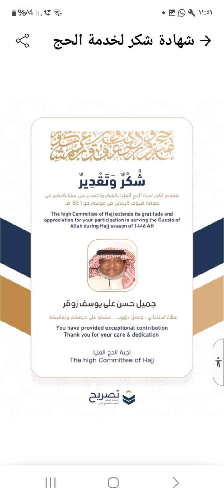 تهانينا للدكتور جميل حسن زوقر بحصوله على شهادة شكر وتقدير علي جهوده المبذولة في خدمة حجاج بيت الله الحرام في مكه والمشاعر من، لجنة الحج العليا، ألف مبروك للدكتور جميل.
