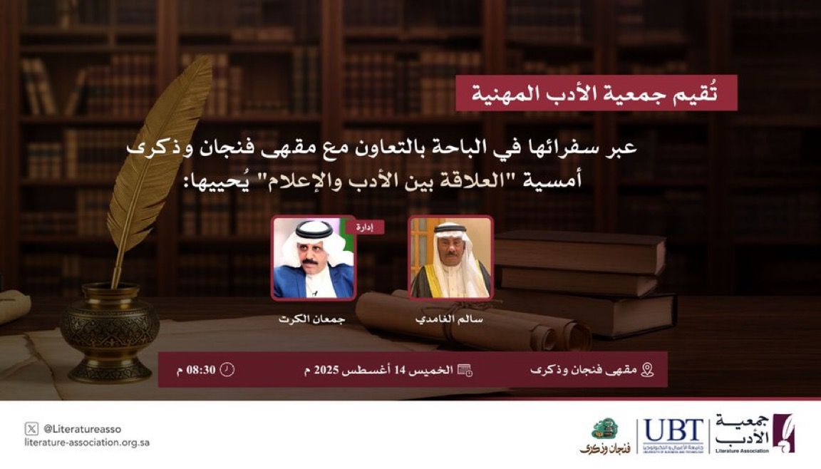 تستضيف جمعية الأدب المهنية مساء اليوم الخميس الإعلامي البارز والكاتب السياسي الأستاذ سالم بن أحمد الغامدي، أحد أقطاب الإعلام السعودي، في أمسية ثقافية بعنوان «العلاقة بين الأدب والإعلام»، وذلك في مقهى فنجان وذكرى بمحافظة بلجرشي.