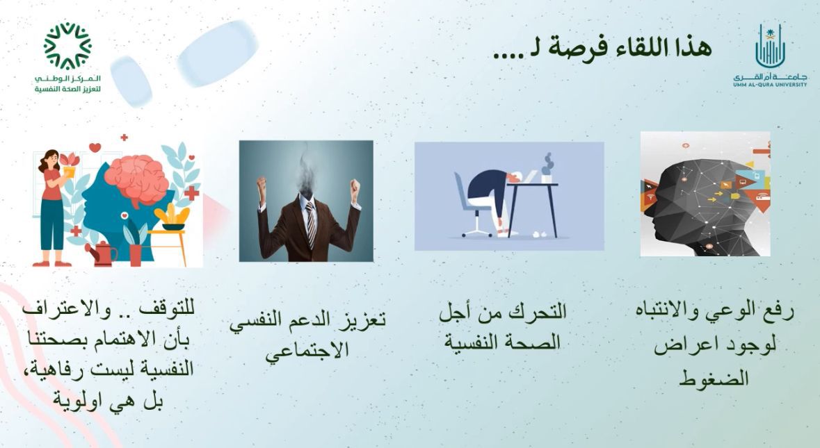 وتناول اللقاء -الذي قدمته الأستاذة غادة بنت محمد نعمان الريّس من المركز الوطني لتعزيز الصحة النفسية – عدة محاور حيث تم التعرف على بعض المفاهيم المتعلقة بضغوط العمل، وأنواعها، ومصادرها، وكيفية إدارة عبء العمل وكيفية استجابة الجسم للضغوط ، ودور المنظمة والمديرين في تعزيز الصحة النفسية في بيئة العمل ودور الموظفين في تحقيق الصحة النفسية في بيئة العمل .