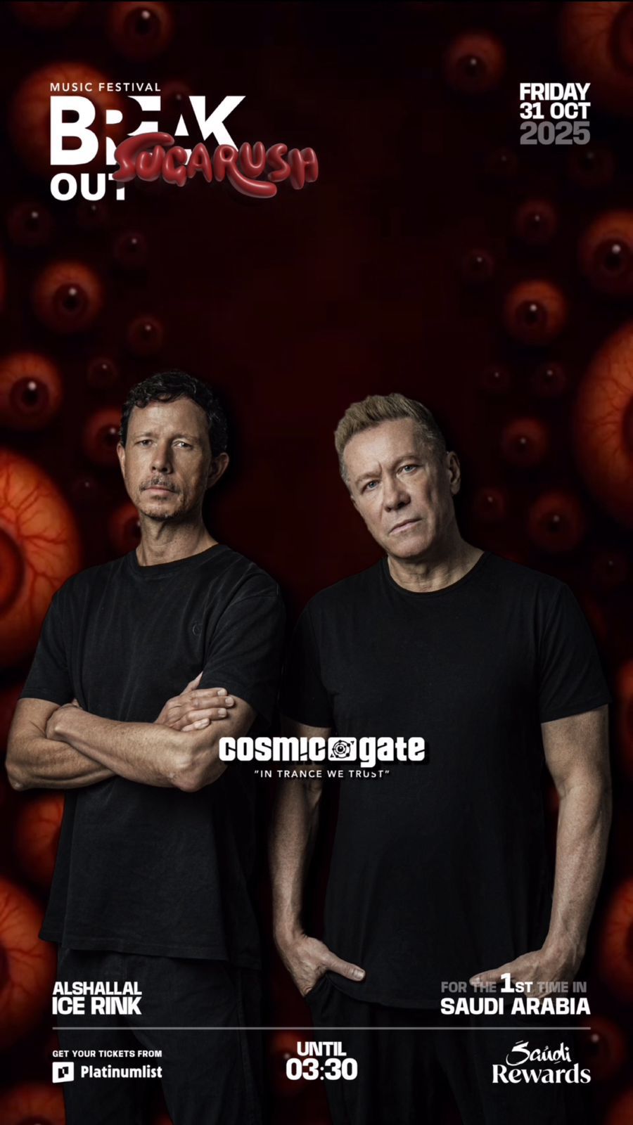 Cosmic Gate الثنائي الألماني الشهير المكوّن من (Nic Chagall) و (DJ Bossi)، الحاصلين على ترشيح جائزة غرامي عن ريمكس “Only Road”. حيث يٌعدّ الثنائي من أساطير موسيقى الترانس عالميًا، ومشاركتهم في الحدث تمثّل الظهور الأول لهم في المملكة، ما يمنح الحفل بُعدًا عالميًا وجاذبية كبيرة لعشاق هذا النوع من الموسيقى.