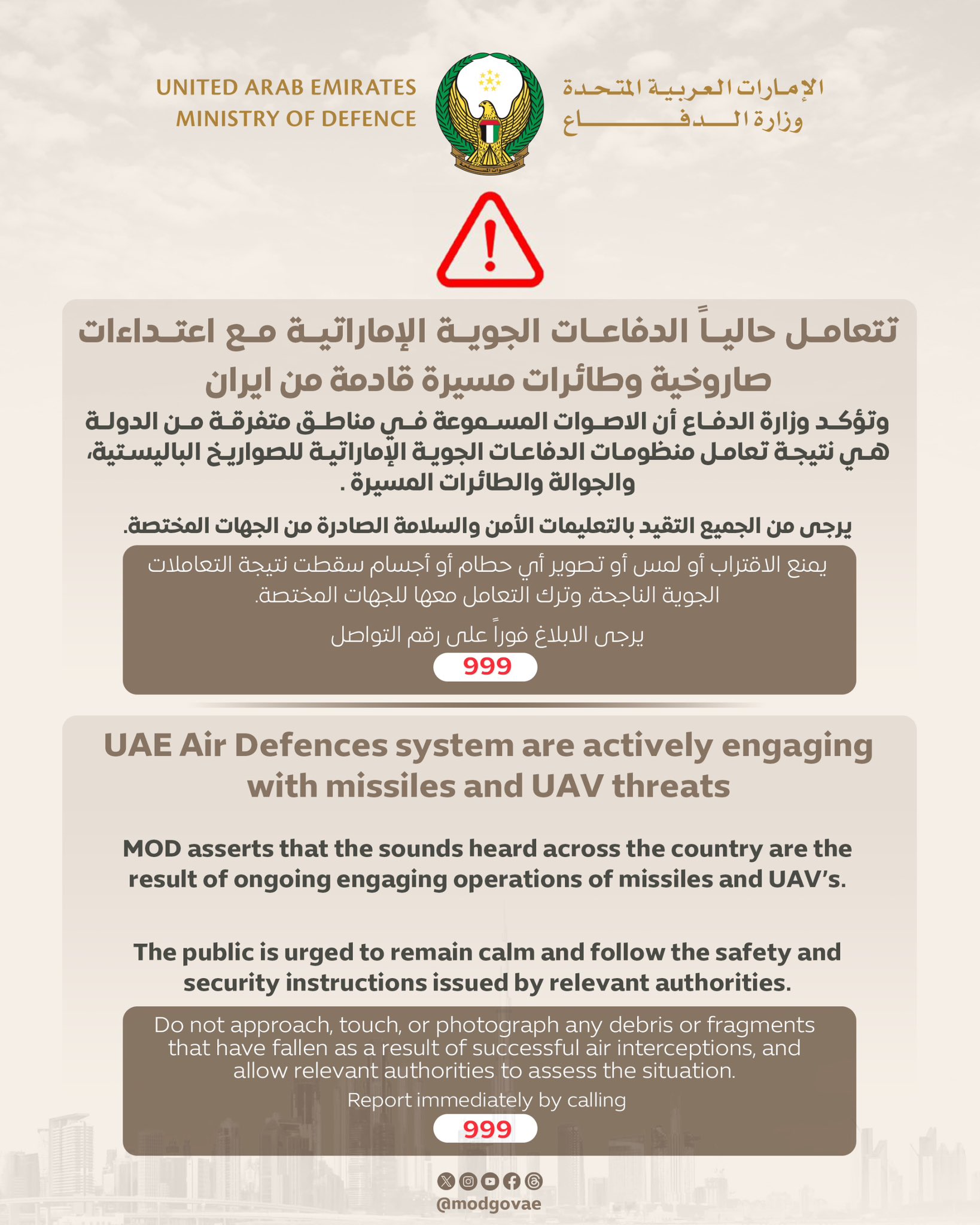 كذلك، أعلنت وزارة الدفاع الإماراتية أن دفاعاتها الجوية تصدت اليوم لهجمات بالصواريخ والطائرات المسيرة. وقالت الوزارة على “إكس”: “تتعامل الدفاعات الجوية الإماراتية حالياً مع اعتداءات صاروخية وطائرات مسيرة قادمة من إيران”.